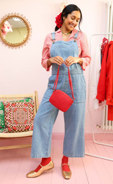 Zeena wears: Porthallow Cove Dunagrees, Farsight Top, Woven Sea Fan Cross Body Bag