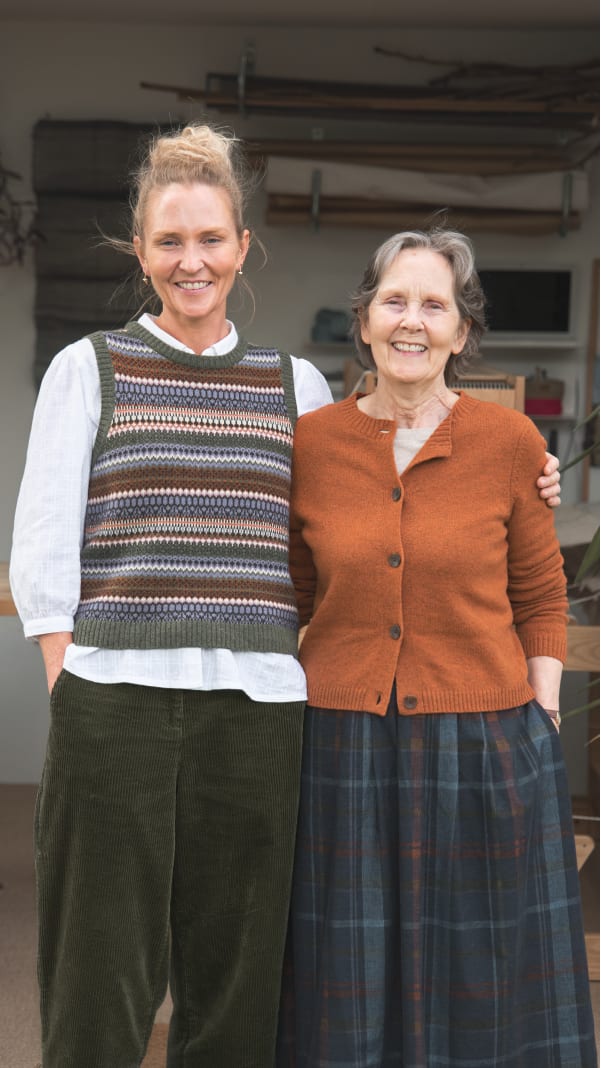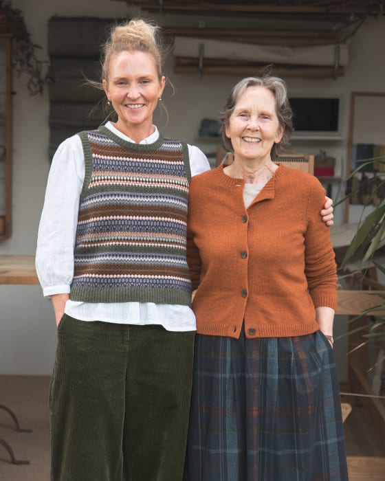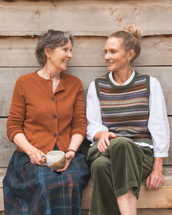 Ellie wears the Percella Cove Vest and Hope Cottage Blouse. Claudia wears the Tern Tide Cardigan.