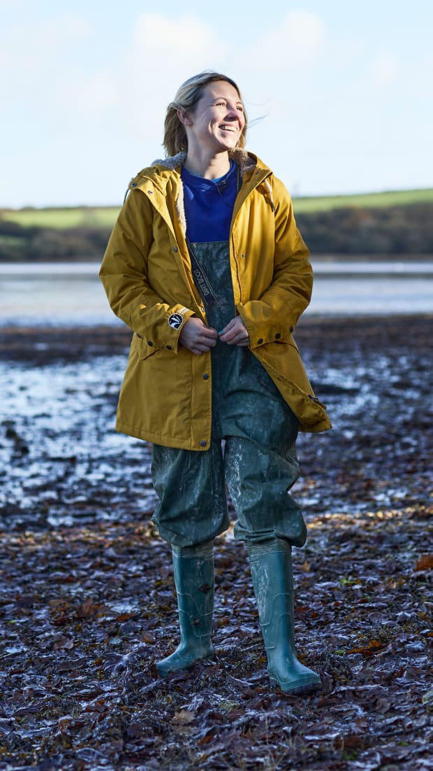Sophie wears our River Sea Coat in Sunflower