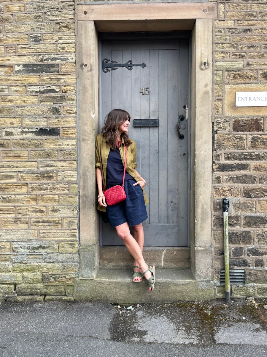 Shelley wears: Beach Road Shirt, Wild Plain Vest, Clover Bloom Shorts, Woven Sea Fan Bag and Salt-Water sandals.
