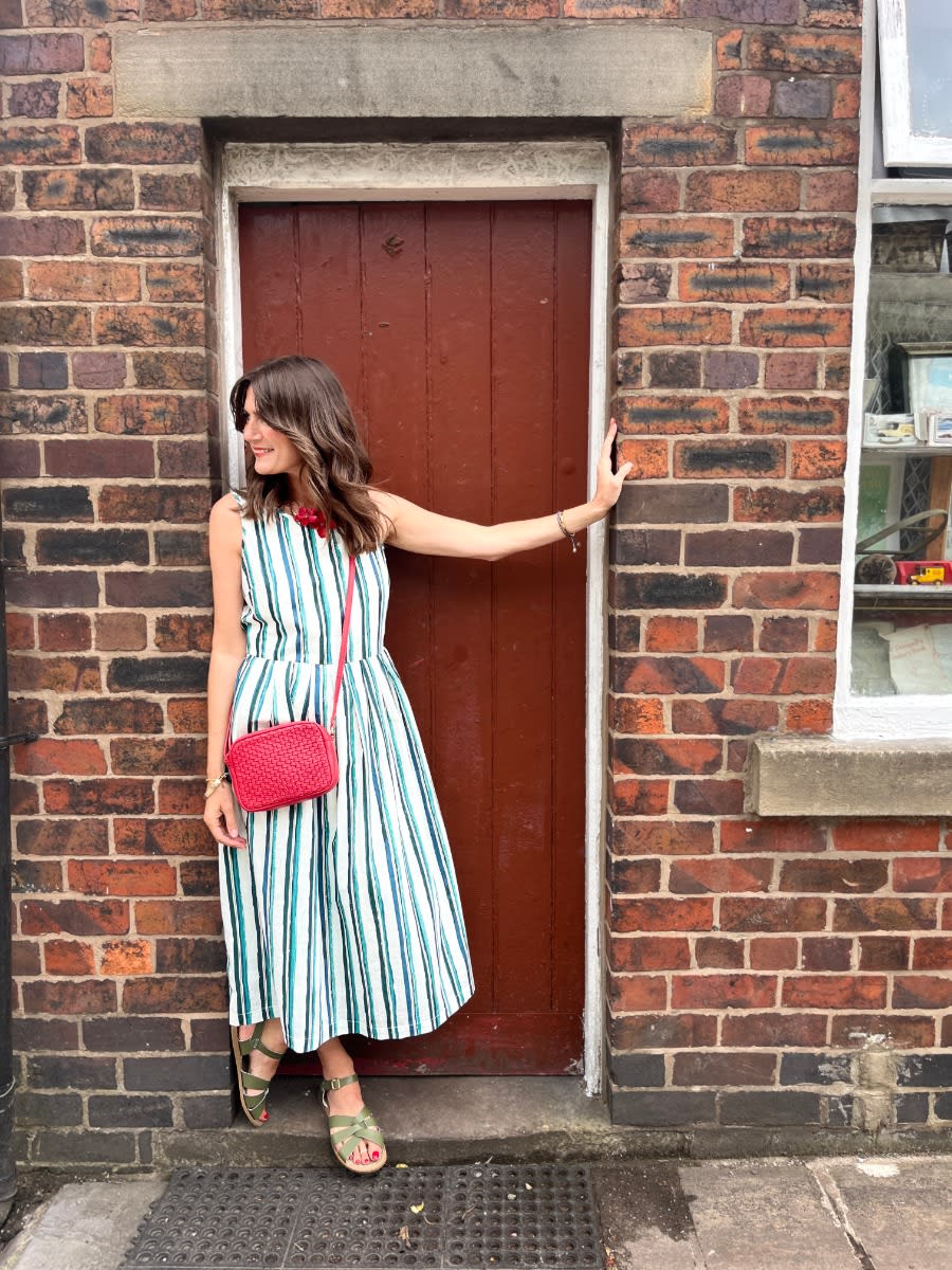 Shelley wears: Tea Spoon Bay Dress, Woven Sea Fan Bag and Salt-Water Sandals.