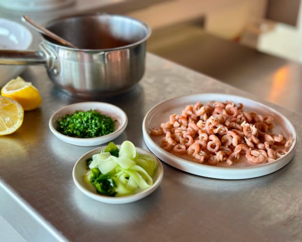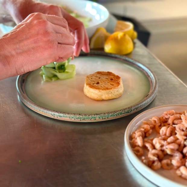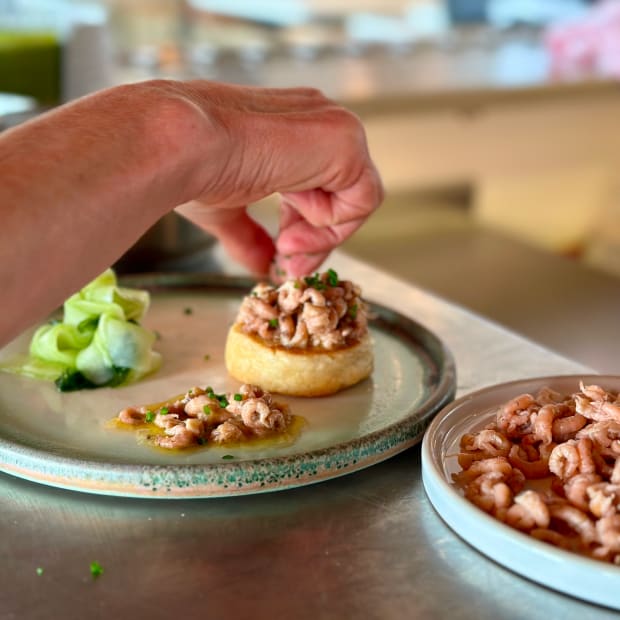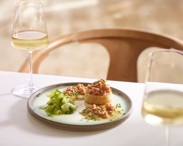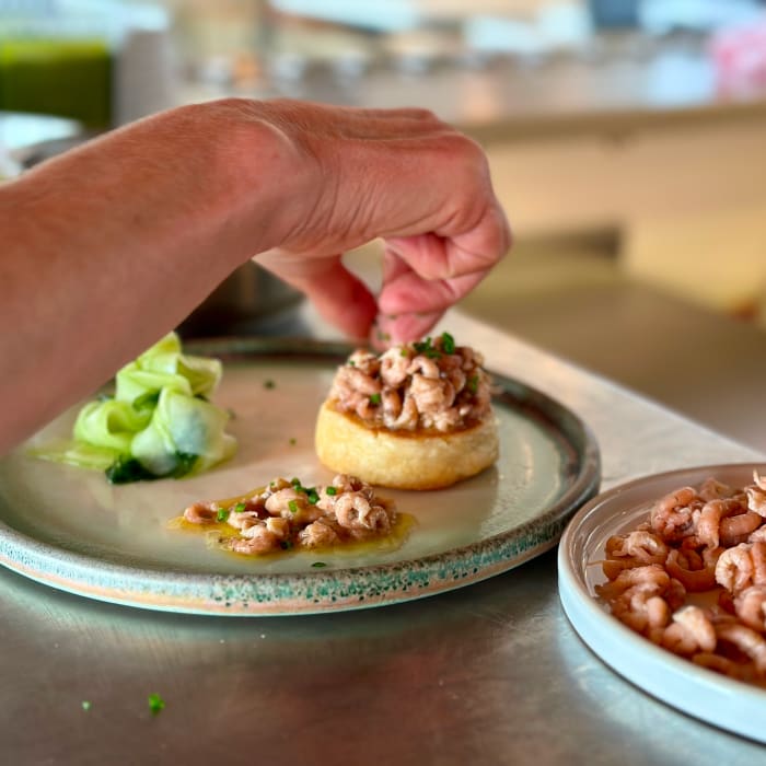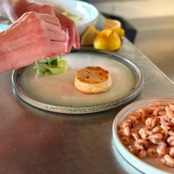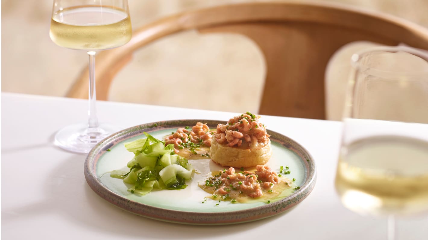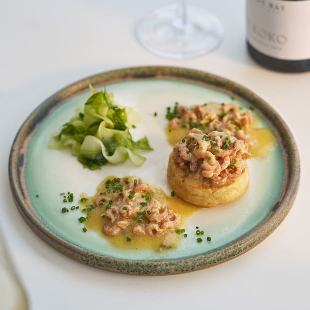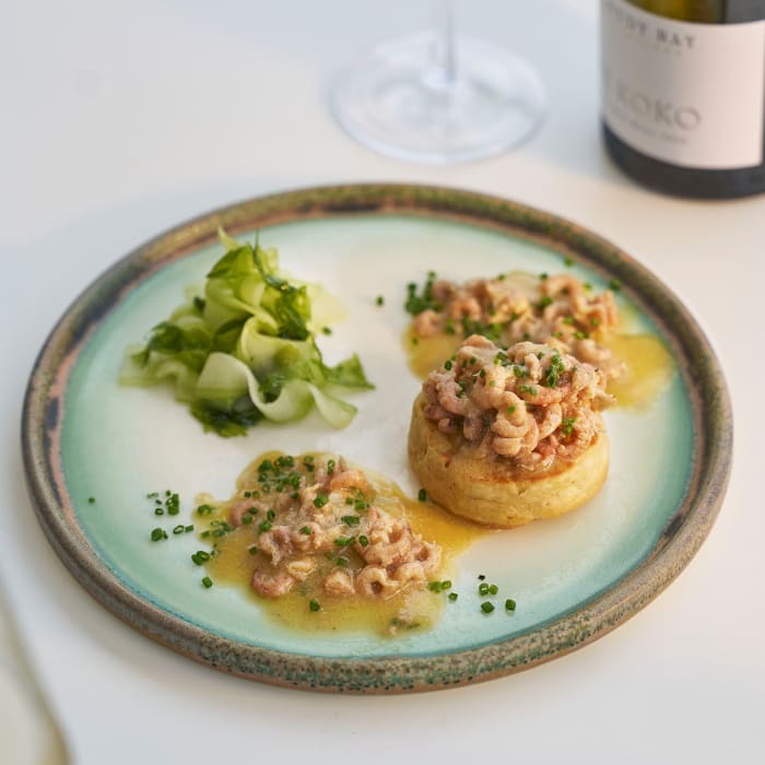 One of its most popular dishes is a fresh twist on a British classic: potted shrimp. Succulent brown shrimps are infused in clarified butter, spices and lemon zest, then placed on a soft, home-made crumpet.